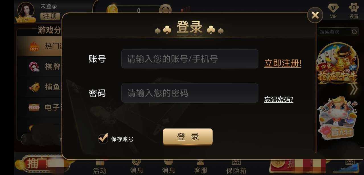 这是一款火爆的棋牌游戏平台,汇聚众多经典好玩的棋牌游戏种类,你想玩的在这里都能找到。游戏界面炫酷,安全性有保证,特色保险箱功能,保护玩家的个人财产不受侵犯,感兴趣的朋友们快来下载体验吧。